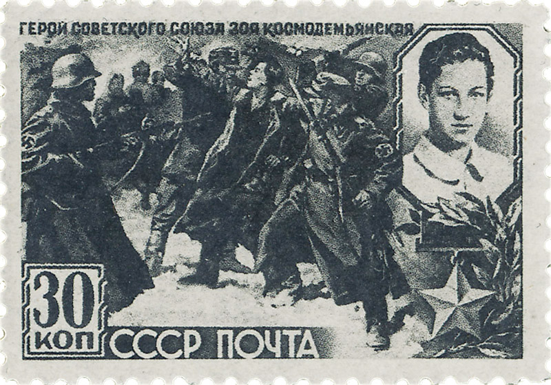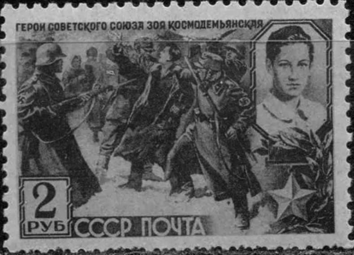 Данная марка посвящена Зое Космодемьянской - советской диверсантке, которая принимала участие в Московской битве и была казнена фашистами в деревне Петрищево в 1941 году.
