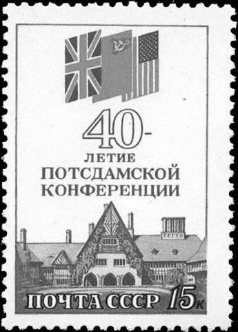 Данная марка посвящена 40-летию Потсдамской конференции, которая проходила с июля по началу августа 1945 г. Следовательно, она была выпущена в 1985 году году (1945+40). Верный ответ - восемьдесят пятом.