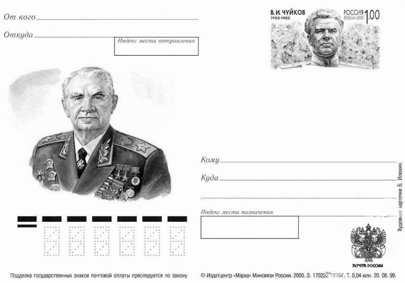 На данном почтовом конверте мы видим советского генерала Василия Чуйкова. Его имя указано в правом верхнем углу. Далее нужно вспомнить, в каком сражении он прославился. В. И. Чуйков командовал 62-й армией во время уличных боёв за Сталинград. Следовательно, название битвы — Сталинградская (слово «битва» писать в ответ не нужно).