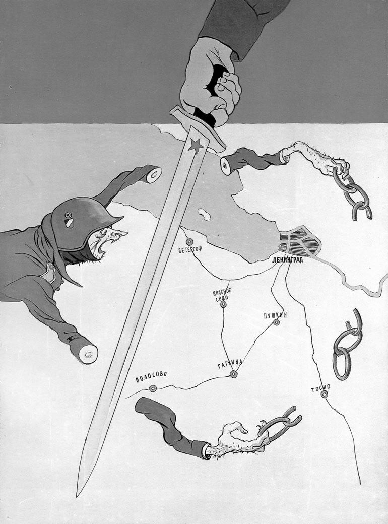 На плакате показан город Лениград и рука с мечом со звездой, разрубающим цепь из рук немецкого солдата. Образ «меч разрубает цепь» — метафора окончательного снятия блокады Ленинграда. Это произошло в ходе наступления Красной армии в январе 1944 года. Раз нам нужно закончить предложение, то ответ: "сорокчетвертом".
