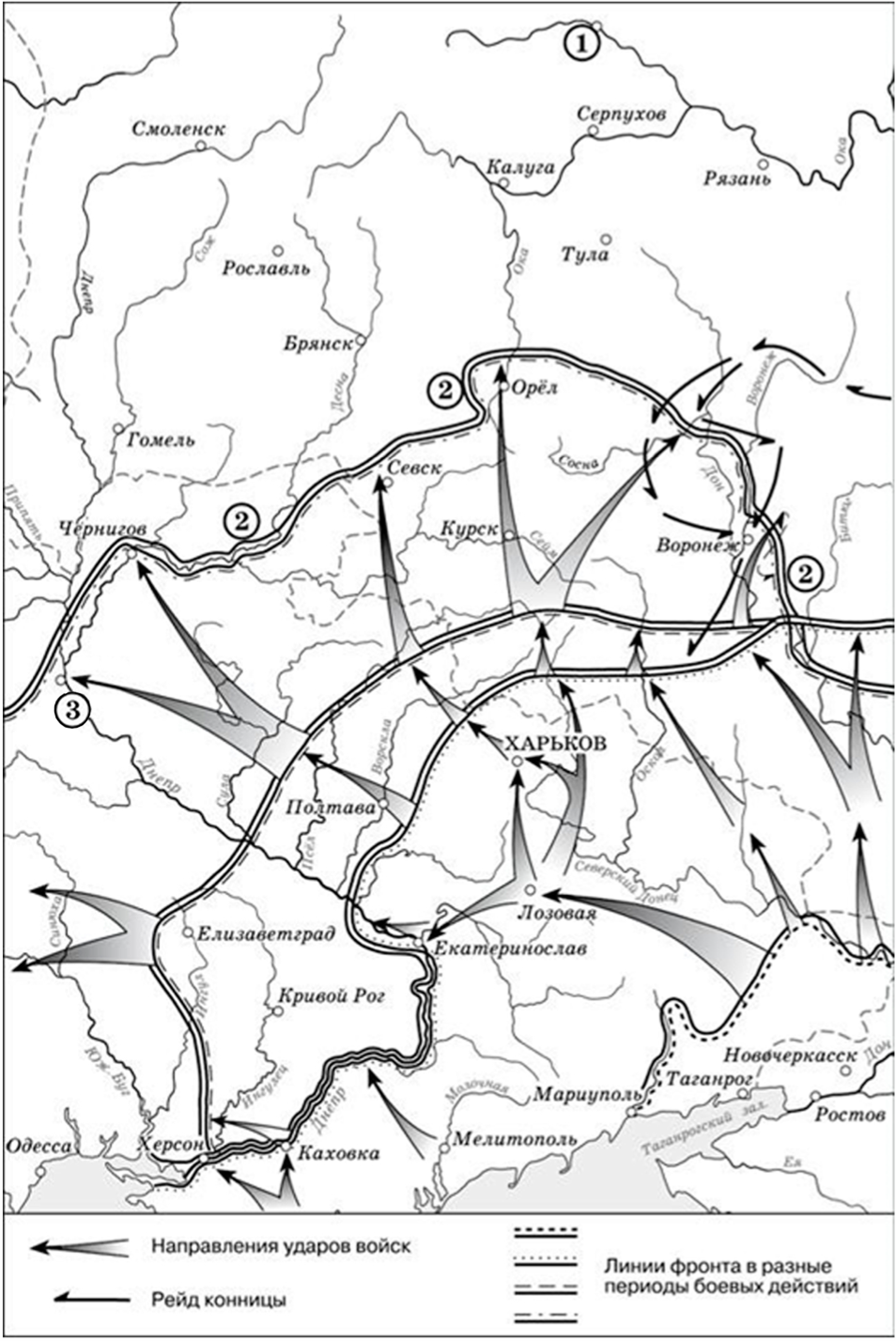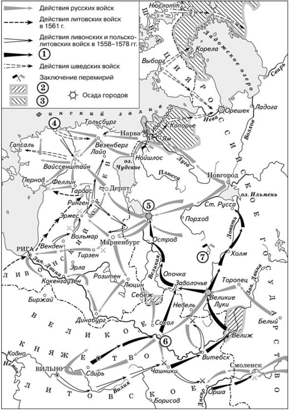 Внимательно посмотрим на карту. На ней отражены события Ливонской войны 1558-1583 годов, которая проходила в период правления Ивана Грозного. Стрелки под цифрой «1» в легенде схемы направляются с территорией великого княжества литовского и доходят до городов на территории Русского царства. Вспоминаем, что эти действия предпринимал польский король Стефан Баторий. Он же выступает и полководцем.