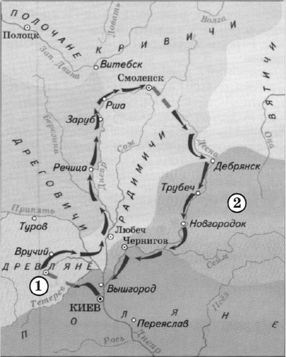 Как называлось племя восточных славян, проживающее на территории, обозначенной на схеме цифрой "2".