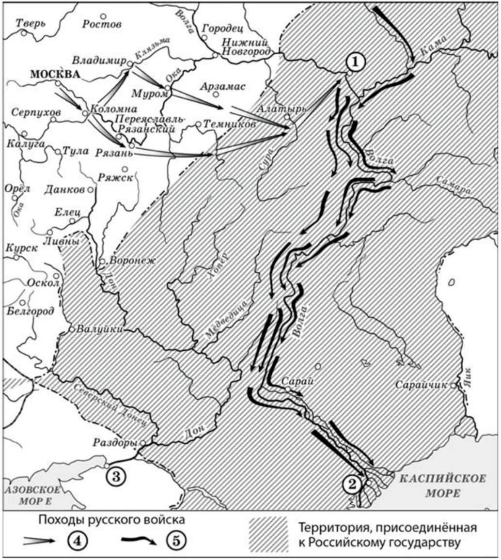Внимательно посмотрим на карту. На ней стрелками обозначены походы из Москвы к территориям по течению Волги, которые обозначены штриховкой. Как мы знаем, крупнейшими городами в этом районе были Казань и Астрахань, которые были присоединены во время правления царя Ивана IV. Обрати внимание, что ответ пишем словами: ивангрозный или иванчетвертый, а не иван 4 или иван IV; одновременно буквы и цифры писать нельзя.