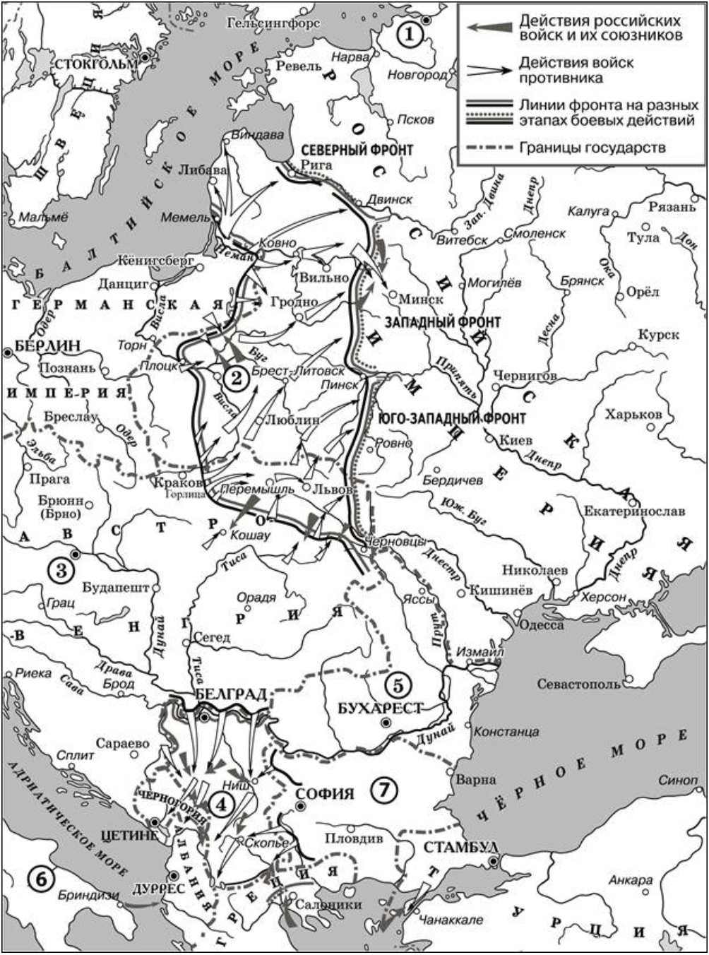 На схеме изображены события Первой мировой войны, а конкретно 1915 года, так как на схеме видно, что действия войск противника (обозначены белыми стрелками) направленны в сторону России, то есть они наступают. При ответе на это задание нужно быть внимательным! Цифрой «1» на схеме обозначен город Санкт-Петербург, но очень важно обращать внимание на фразу из задания: «в период, когда происходили отражённые на схеме события». Если есть такая формулировка, то значит в задании подвох! В ответ мы должны писать "Петроград", так как во время Первой Мировой войны Санкт-Петербург был переименован (в августе 1914 года).