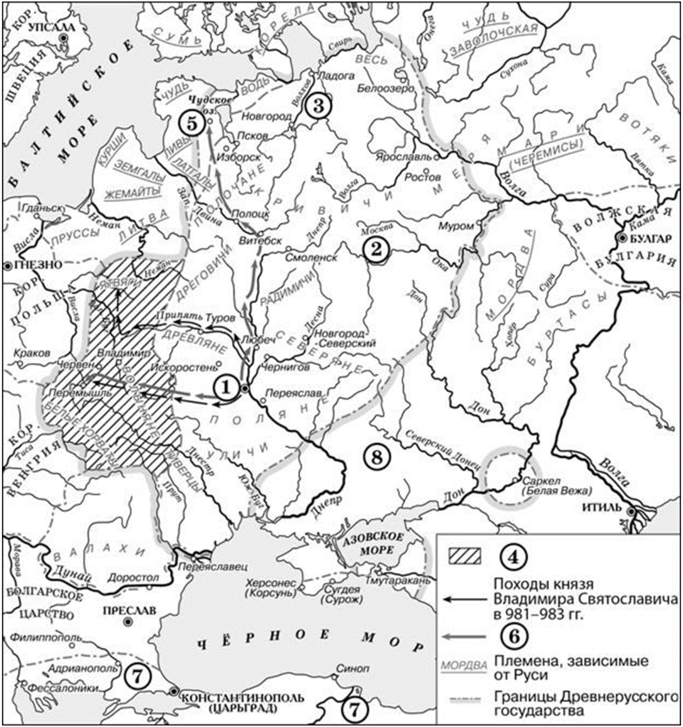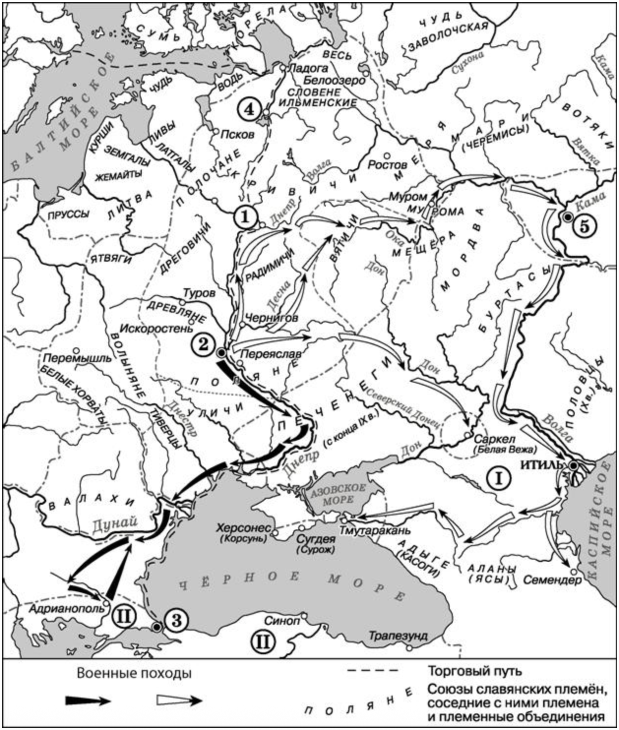 Данная карта посвящена 10-му веку и походом киевского князя Святослава Игоревича. Мы понимаем это исходя из направления стрелок на восток и юг. На востоке Святослав разгромил государство Хазарский каганат, столицей которого был город Итиль. Именно это государство и обозначено на карте римской цифрой «I».
