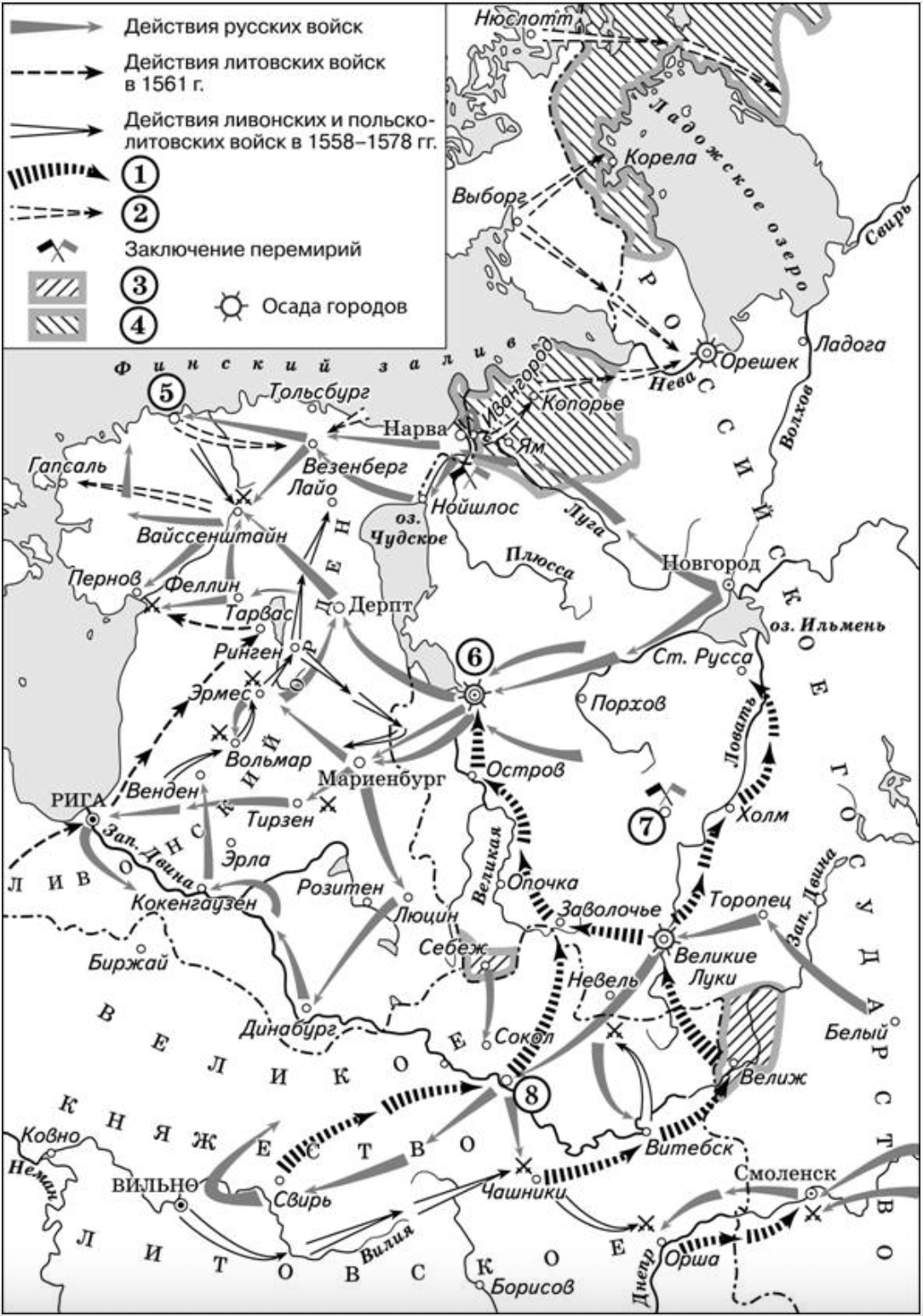 Внимательно посмотрим на карту. На ней отражены события Ливонской войны 1558-1583 годов, которая проходила в период правления Ивана Грозного. Во-первых, это становится сразу понятно исходя из дат, которые прямо указаны в легенде схемы.