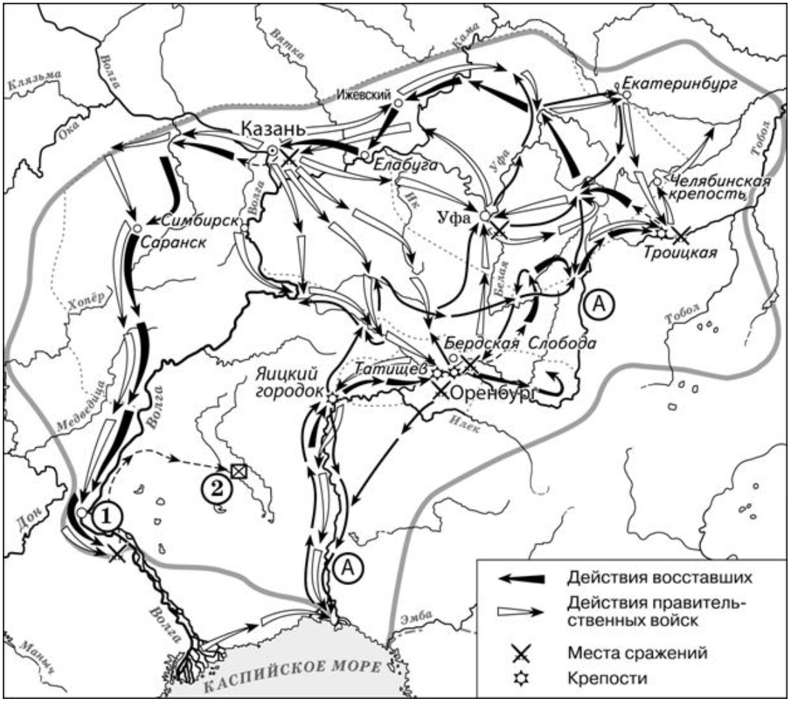 События, обозначенные на схеме, относятся к восстанию под предводительством Емельяна Пугачёва. Это подтверждается указанием таких ключевых пунктов, как Оренбург, Яицкий городок, Казань, Симбирск, а также направлениями движения восставших и правительственных войск. Именно в этих регионах проходили основные боевые действия в ходе крупнейшего крестьянского восстания XVIII века. Оно началось на территории Яицкого казачьего войска и вскоре охватило Поволжье, Урал и Прикамье. Восстание началось в 1773 году, но ответ пишем: семьдесят третьем, потому что нам нужно закончить предложение.
