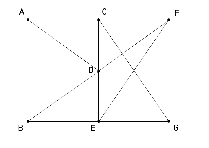 Населённые пункты А, С, F и G имеют по 3 дороги, но пункт С единственный, который соединён с 3 другими пунктами по 3 дороги. Поэтому можно начать определение пунктов именно с С. С другой стороны, пункт G единственный, у кого есть соединения с двумя пунктами по 2 дороги. А пункт D единственный, кто имея 2 дороги, соединён с пунктами у кого по 3 дороги.