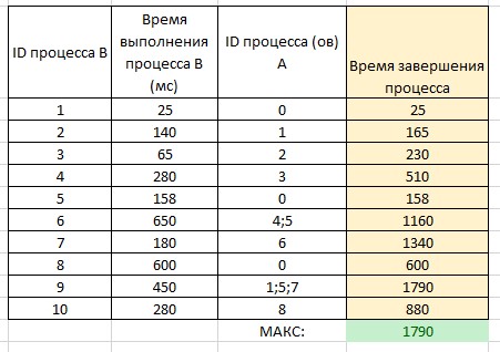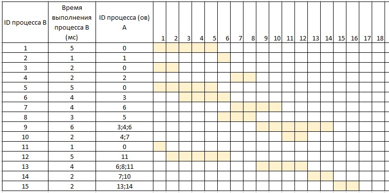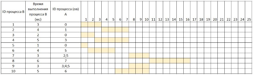 | ID процесса B | Время выполнения процесса B (мс) | ID процесса(ов) A |