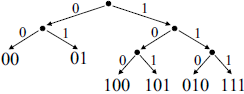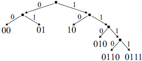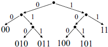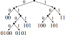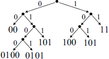 Для решения данной задачи рассмотрим дерево, у которого из корня и любой вершины выходят по две ветви. Сопоставим с каждой левой ветвью 0, а с каждой правой - 1 (см. рис.). Тогда, проходя от вершины к каждому из листьев (узлов, из которых не выходят ветви) и выписывая последовательность нулей и единиц, соответствующих обходу дерева, получим набор кодовых слов, образующих префиксный код (код, в котором ни одно кодовое слово не является началом другого).