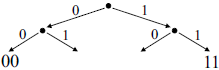 Согласно условию задачи, искомый код должен содержать слова 00 и 11. Значит, узлы, соответствующие этим кодовым словам, должны соответствовать листьям дерева. На основе этих данных построим дерево (см. рис.).