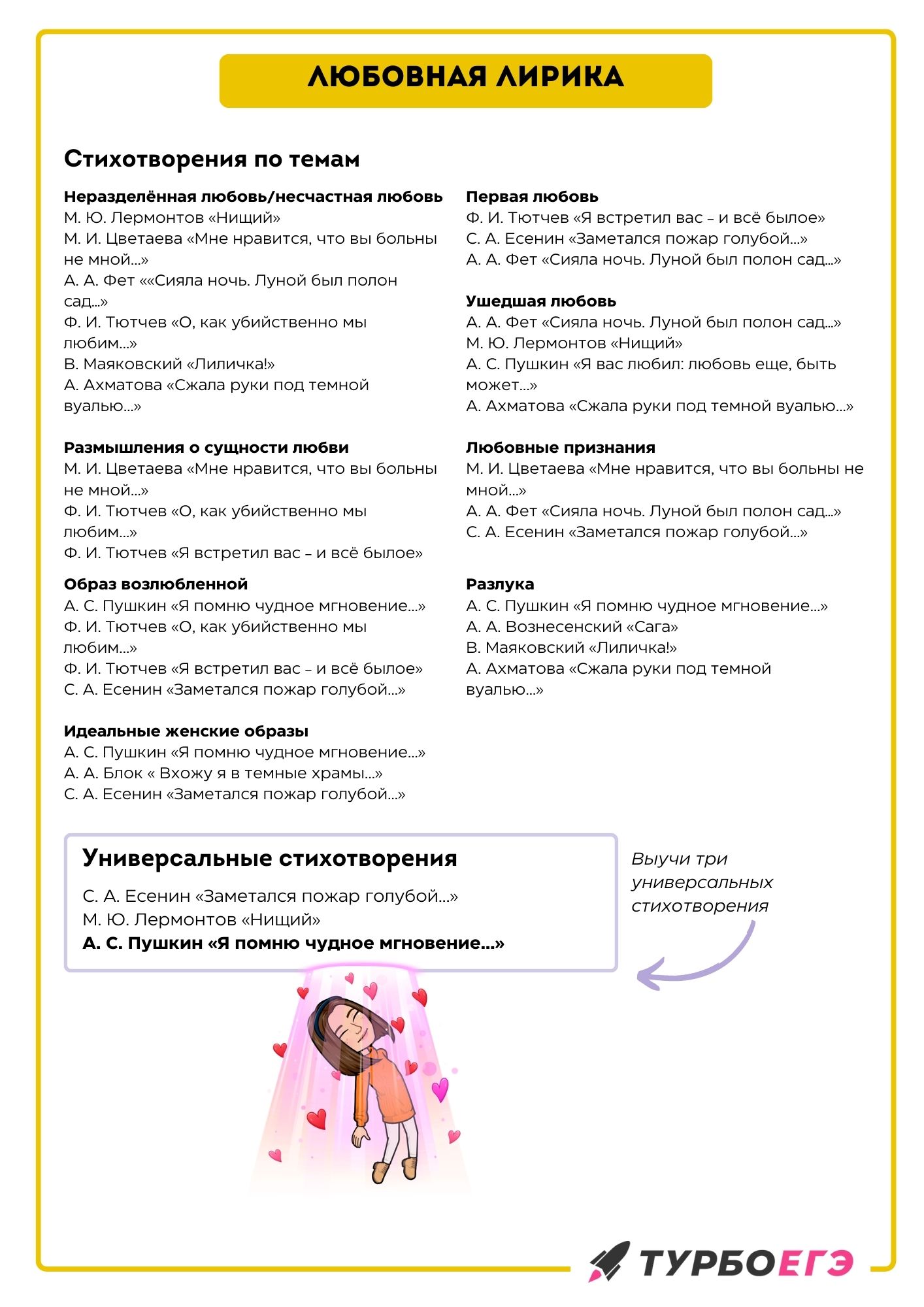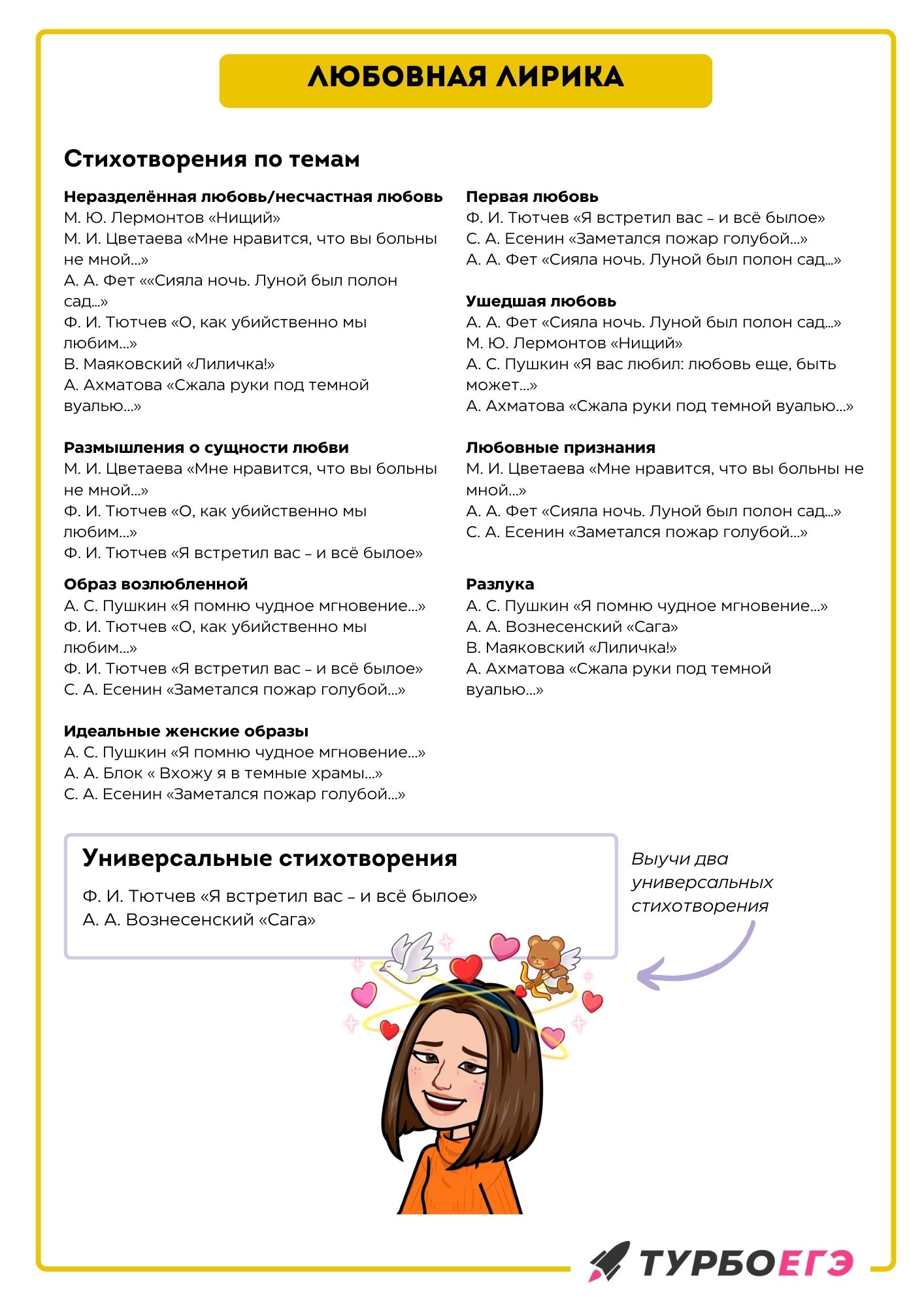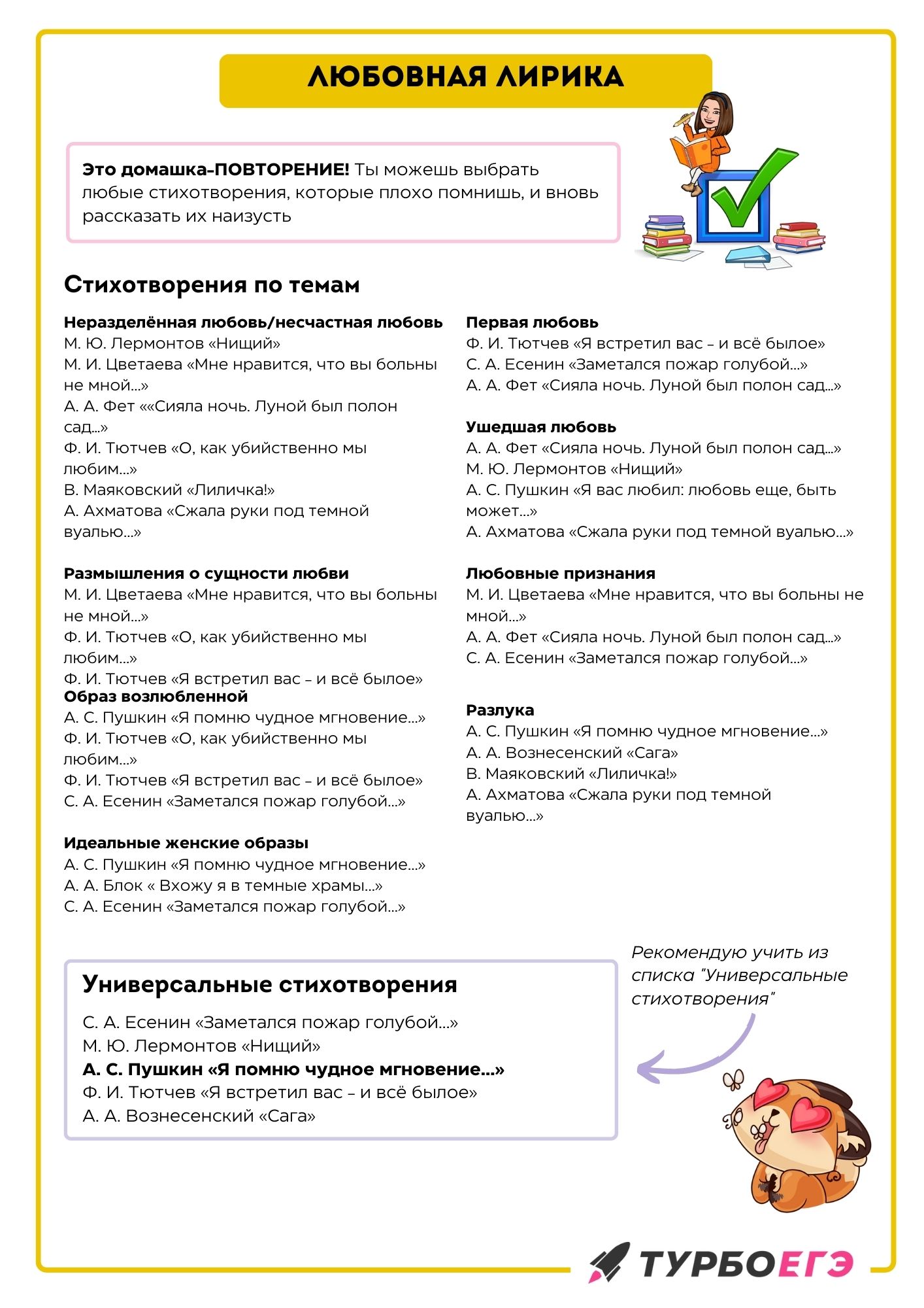 ЭТО ЗАЧЁТ-ПОВТОРЕНИЕ! Выбери любые стихотворения из любовной лирики (2 и более), которые плохо помнишь, и вновь расскажи их наизусть. Видео отправь в лс группы (в вк можно записывать видео-кружочек). Преподаватель проверит твоё чтение наизусть и пришлёт тебе кодовое слово. Введи его в поле ответа.