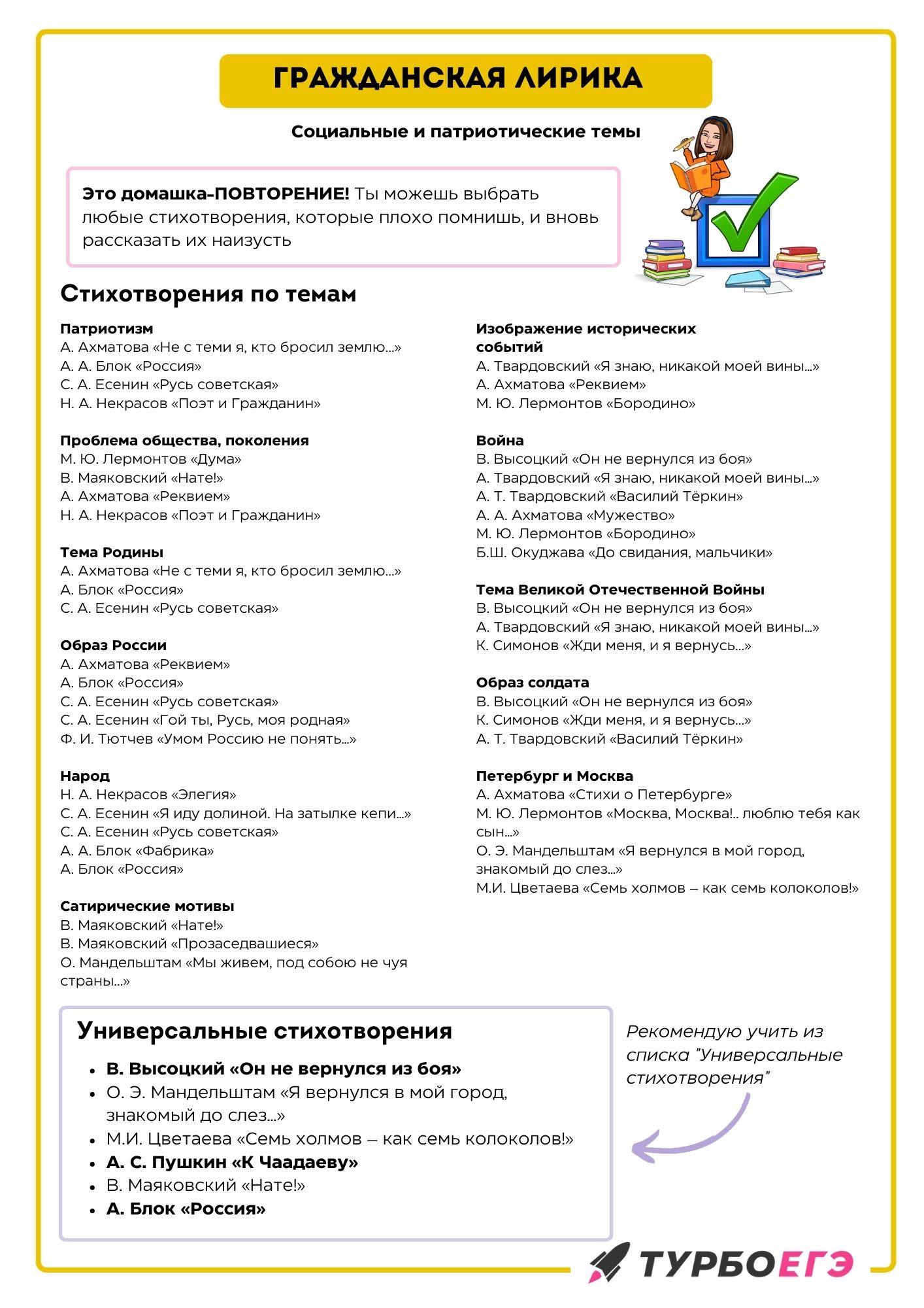 ЭТО ЗАЧЁТ-ПОВТОРЕНИЕ! Выбери любые стихотворения из гражданской лирики (2 и более), которые плохо помнишь, и вновь расскажи их наизусть. Видео отправь в лс группы (в вк можно записывать видео-кружочек). Преподаватель проверит твоё чтение наизусть и пришлёт тебе кодовое слово. Введи его в поле ответа.