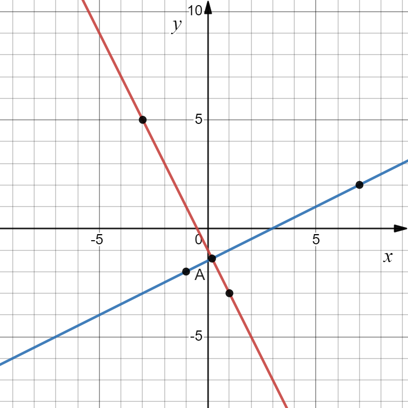 На рисунке изображены графики двух функций вида f(x)=kx+b и g(x)=kx+b, которые пересекаются в точке $A$. Найдите ординату точки пересечения графиков.