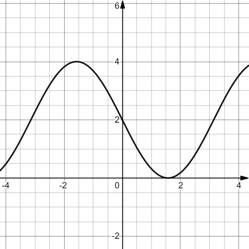 По рисунку определяем, что наибольшее значение функции 2, наименьшее 1. При пересечении оси $Oy$ функция принимает наименьшее значение, значит коэффициент $a=-0,5$ Функция принимает вид ${f(x) = {-0,5}cos{x}+b}$. Функция достигает наибольшего значения при $cos{x}=1 ⇒ b=1,5$