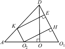 $BC ⊥ AO_1$ и $BC ⊥ DO_1$ (как высоты треугольников $ABC$ и $DBC$), значит, $BC$ перпендикулярна плоскости $ADO_1$, и тогда $BC$ перпендикулярна любой прямой этой плоскости, например $O_2H$. По построению $O_2H ⊥ DO_1$, значит, $O_2H$ перпендикулярна двум пересекающимся прямым плоскости $BCD$, и тогда отрезок $O_2H$ перпендикулярен плоскости $BCD$ и равен расстоянию от $O_2$ до плоскости $BCD$.
