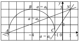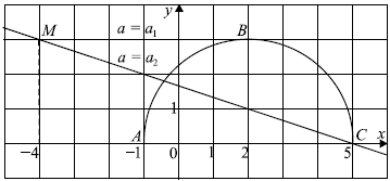 Рассмотрим рисунок. Видно, что прямая и полуокружность имеют две общие точки, если $a_2 ≤ a < a_1$. Прямая $BM$ касается окружности, её угловой коэффициент равен $0$, значит, $a_1 = 0$. Найдём $a_2$ из условия, что прямая $MC$: $y = a(x + 4) + 3$ проходит через точку $C(5; 0)$, то есть $y(5) = 0$.