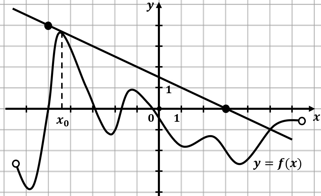 На рисунке изображены график функции $𝑦=𝑓(𝑥)$ и касательная к этому графику, проведенная в точке $𝑥_0$. Найдите значение производной функции $𝑔(𝑥)=12⋅𝑓(𝑥)−6𝑥$ в точке $𝑥_0$.