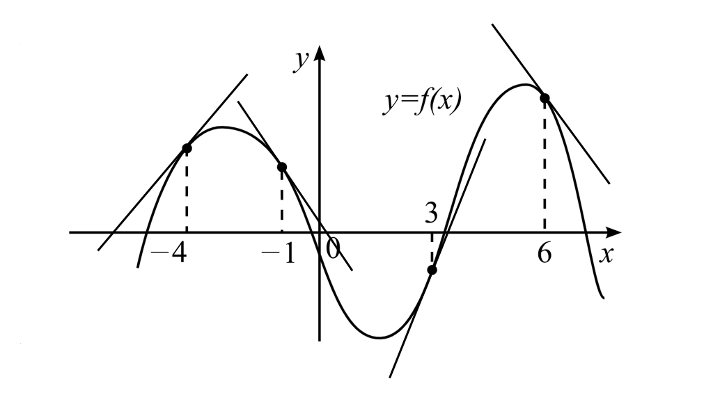 На рисунке изображён график функции $y=f(x)$ и отмечены точки $-4; -1; 3; 6$. В какой из этих точек значение производной наибольшее? В ответе укажите эту точку.