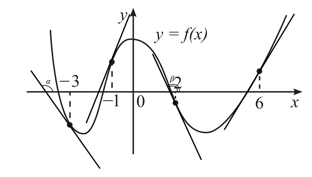 Значение производной в точке $x_0$ равно угловому коэффициенту касательной, проведённой к графику этой функции в точке с абсциссой $x_0$. $f'(x)$ наименьшее в точке, в которой касательная образует самый маленький тупой угол с осью $Ox$ («горка» в этом месте на вид «самая крутая»). Проведём касательные в заданных точках (см. рис.). Тупые углы (а значит, $f'(x)<0$) в точках $x=-3$ и $x=2$. $β<α$, значит, наименьшая производная в точке $2$.