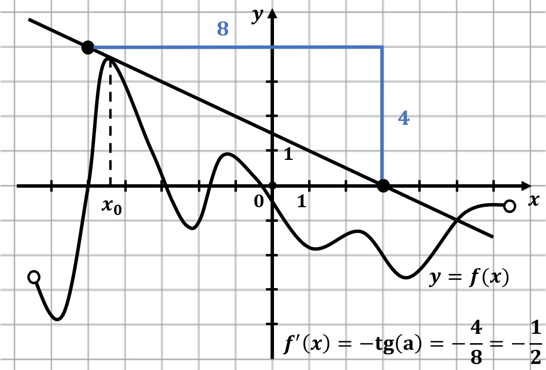 $f'(x_0)=tgα={2}/{4}=0,5;$