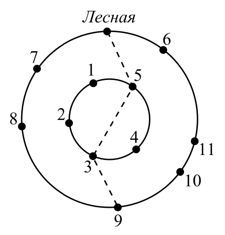 На рисунке представлена схема метро в городе N, состоящего из трёх веток. Две ветки метро имеют форму окружностей и называются Малым и Большим кольцами в соответствии со своими радиусами. На Большой кольцевой ветке расположены станции Лесная, Аэропорт, Западная, Площадь Роз, Озёрная, Зоопарк и Научная (станции указаны в порядке следования друг за другом), а на Малой кольцевой — Оранжерейная, Инструментальная, Дачная, Парковая и Историческая (станции также указаны в порядке следования друг за другом). Ещё есть третья, связующая ветка метро, она начинается со станции Лесная, от которой последовательно идёт через станции Парковая, Оранжерейная и Площадь Роз.