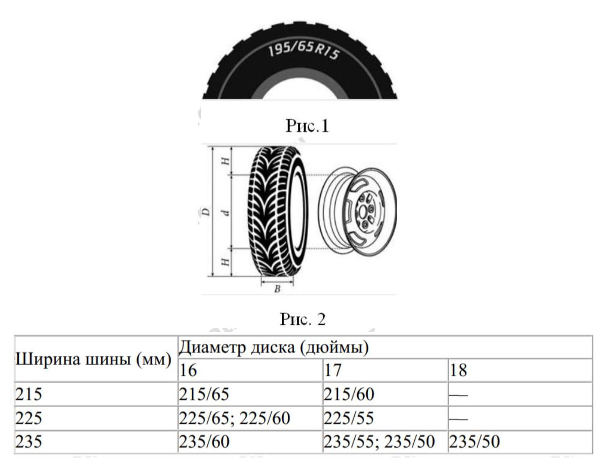 Автомобильное колесо представляет из себя металлический диск с установленной на него резиновой шиной. Диаметр диска совпадает с диаметром внутреннего отверстия в шине. Для маркировки автомобильных шин применяется единая система обозначений. Например, 195/65 R15 (рис. 1). Первое число означает ширину шины в миллиметрах (размер B на рис. 2). Второе число — высота боковины шины H в процентах от ширины шины. Например, шина с маркировкой 195/65 R15 имеет ширину B = 195 мм и высоту боковины H=195 · 0, 65 = 126, 75 (мм). Буква R означает, что шина имеет радиальную конструкцию, то есть нити каркаса в боковине шины расположены вдоль радиусов колеса. Такие шины применяются на всех легковых автомобилях. За буквой R следует диаметр диска колеса d в дюймах (в одном дюйме 25,4 мм). Таким образом, общий диаметр колеса D можно найти, зная диаметр диска и высоту боковины. Завод производит легковые автомобили определённой модели и устанавливает на них колёса с шинами 215/65 R16.