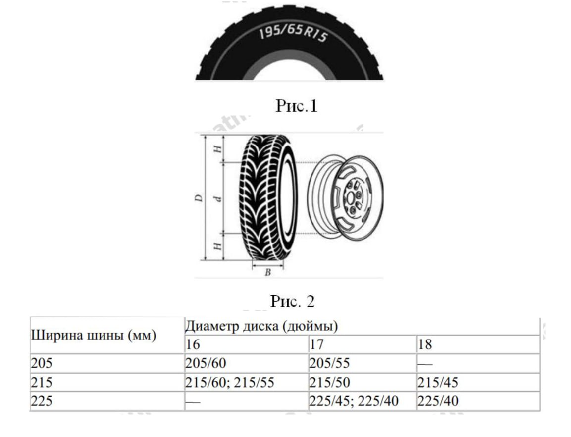 Автомобильное колесо представляет из себя металлический диск с установленной на него резиновой шиной. Диаметр диска совпадает с диаметром внутреннего отверстия в шине. Для маркировки автомобильных шин применяется единая система обозначений. Например, 195/65 R15 (рис. 1). Первое число означает ширину шины в миллиметрах (размер B на рис. 2). Второе число — высота боковины шины H в процентах от ширины шины. Например, шина с маркировкой 195/65 R15 имеет ширину B = 195 мм и высоту боковины H=195 · 0, 65 = 126, 75 (мм). Буква R означает, что шина имеет радиальную конструкцию, то есть нити каркаса в боковине шины расположены вдоль радиусов колеса. Такие шины применяются на всех легковых автомобилях. За буквой R следует диаметр диска колеса d в дюймах (в одном дюйме 25,4 мм). Таким образом, общий диаметр колеса D можно найти, зная диаметр диска и высоту боковины. Завод производит легковые автомобили определённой модели и устанавливает на них колёса с шинами 205/60 R16.