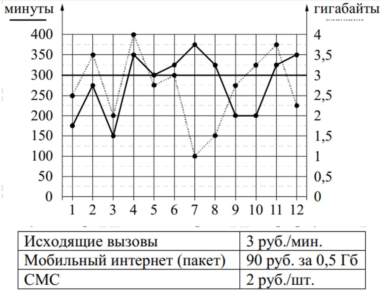 На рисунке точками показано количество минут исходящих вызовов и трафик мобильного интернета в гигабайтах, израсходованных абонентом в процессе пользования смартфоном, за каждый месяц 2019 года. Для удобства точки, соответствующие минутам и гигабайтам, соединены сплошными и пунктирными линиями соответственно.