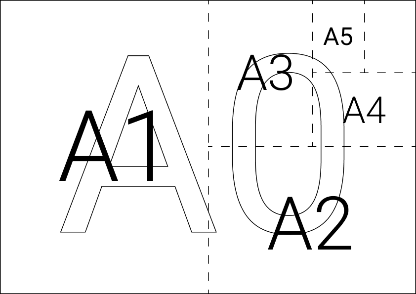 Общепринятые форматы листов бумаги называют комбинацией буквы А и определенной цифрой (А0, А1, А2, А3 и так далее). Лист формата А0 имеет прямоугольную форму площадью 1 кв. м. Если лист формата А0 разделить пополам параллельно меньшей стороне, то получается два листа формата А1. Если А1 разделить так же пополам, то получается два листа формата А2. И так далее с остальными форматами бумаги.