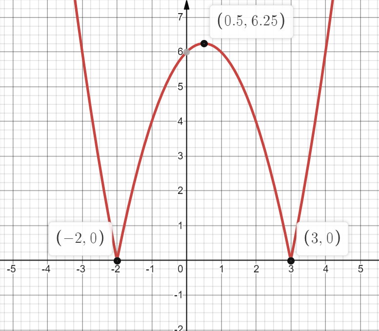 Под модулем находится вся квадратичная функция, поэтому достаточно построить график функции $y=x^2-x-6$ с помощью определения вершины параболы, нулей функции и дополнительных точек и отразить относительно оси Ox: