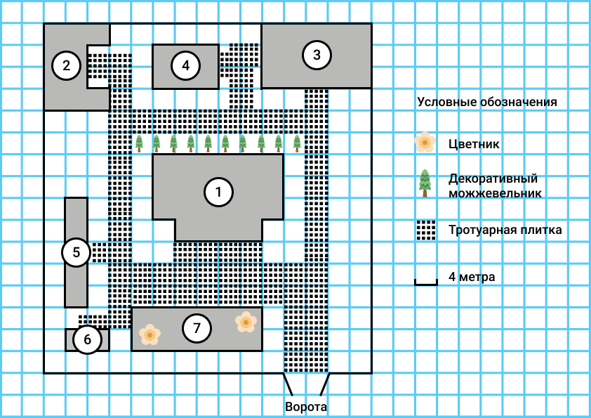 Все дорожки внутри участка вымощены тротуарной плиткой. Каждая клетка плана размером 4 на 4 метра вмещает в себя 25 плиток размером 80 см×80 см.
