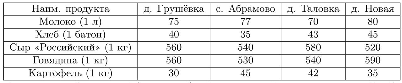 В таблице указана стоимость (в рублях) некоторых продуктов в четырёх магазинах, расположенных в деревне Грушёвка, селе Абрамово, деревне Таловка и деревне Новая.