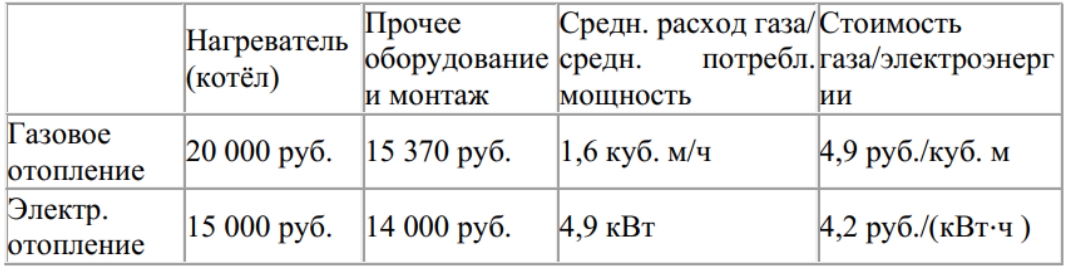 Хозяин участка планирует установить в жилом доме систему отопления. Он рассматривает два варианта: электрическое или газовое отопление. Цены на оборудование и стоимость его установки, данные о расходе газа, электроэнергии и их стоимости даны в таблице.