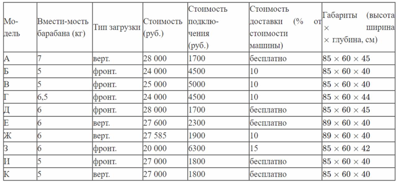 В квартире планируется установить стиральную машину. Характеристики стиральных машин, условия подключения и доставки приведены в таблице. Планируется купить стиральную машину с вертикальной загрузкой, не превосходящую 85 см по высоте.
