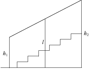 Перила лестницы дачного дома для надёжности укреплены посередине вертикальным столбом. Найдите высоту $l$ этого столба, если наименьшая высота $h_1$ перил равна 50 см, а наибольшая высота $h_2$ равна 100 см. Ответ дайте в сантиметрах.