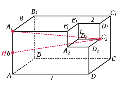 Найдите квадрат расстояния между вершинами $A_1$ и $C_2$ многогранника, изображённого на рисунке.