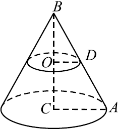 $OD ‖ AC$, следовательно, $△ABC ∼ △DBO$ по первому признаку подобия ($∠ACB = ∠DOB = 90°, ∠ABC$ - общий). По условию $BO = 7, OC = 21$, значит, $BC = 28$, откуда ${BO}/{BC} = {OD}/{AC} = {1}/{4}, {πr^2}/{πR^2} = {1}/{16}$. Значит, площадь сечения конуса плоскостью, параллельной плоскости основания конуса, в $16$ раз меньше плоскости основания конуса, то есть равна $64 : 16 = 4$.