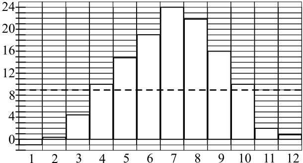 Выше неё расположено 7 столбиков, поэтому всего 7 месяцев, когда среднемесячная температура превышала 9 градусов Цельсия.
