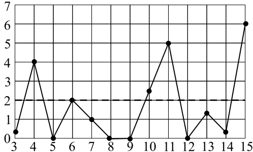 На рисунке жирными точками показано суточное количество осадков, выпадавших в городе N с 3 по 15 апреля 1950 года. По горизонтали указываются числа месяца, по вертикали — количество осадков, выпавших в соответствующий день, в миллиметрах. Для наглядности жирные точки на рисунке соединены линией. Определите по рисунку, сколько дней из данного периода выпадало менее 2 миллиметров осадков.