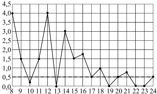 На рисунке жирными точками показано суточное количество осадков, выпадавших в Томске с 8 по 24 января 2005 года. По горизонтали указываются числа месяца, по вертикали — количество осадков в миллиметрах. Для наглядности жирные точки на рисунке соединены линией. Определите по рисунку, сколько дней выпадало более $0{,}5$ миллиметров осадков.