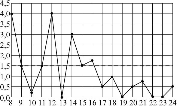 На рисунке жирными точками показано суточное количество осадков, выпадавших в Томске с 8 по 24 января 2005 года. По горизонтали указываются числа месяца, по вертикали — количество осадков в миллиметрах. Для наглядности жирные точки на рисунке соединены линией. Определите по рисунку, сколько дней выпадало более $1{,}5$ миллиметров осадков.