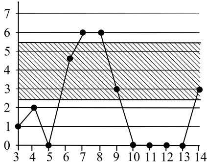 На рисунке жирными точками показано суточное количество осадков, выпадавших в посёлке Солнечном с 3 по 14 октября 2011 года. По горизонтали указываются числа месяца, по вертикали — количество осадков, выпавших в соответствующий день, в миллиметрах. Для наглядности жирные точки на рисунке соединены линией. Определите по рисунку, сколько дней из данного периода выпадало от $2{,}5$ до $5{,}5$ мм осадков.