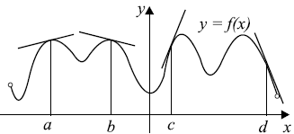 Рассмотрим график функции $y = f(x)$ и касательные в точках $a$, $b$, $c$ и $d$. Значение производной функции в точке равно угловому коэффициенту касательной к графику функции в этой точке.