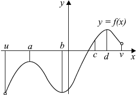 | А) $(u; a)$ Б) $(a; b)$ В) $(b; c)$ Г) $(c; d)$ | 1) промежуток содержит одну точку максимума 2) промежуток содержит точку, в которой функция меняет знак с "-" на "+" 3) во всех точках промежутка производная больше нуля 4) промежуток содержит одну точку минимума |