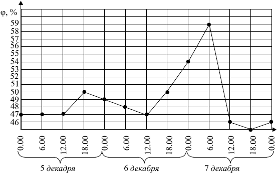 | А) 5 декабря с 0:00 до 12:00 Б) с 18:00 5 декабря до 12:00 6 декабря В) с 12:00 6 декабря по 6:00 7 декабря Г) 7 декабря с 12:00 до полуночи | 1) влажность резко повышалась 2) влажность не изменялась 3) влажность равномерно понижалась 4) влажность была не более 46% |