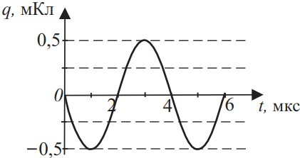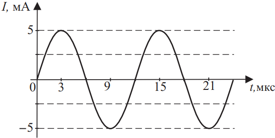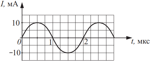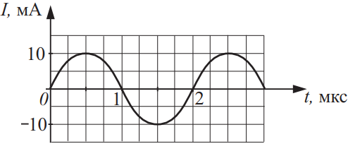 На рисунке приведена зависимость силы тока в колебательном контуре от времени. Какова индуктивность катушки, если ёмкость конденсатора равна 1 пФ? Ответ округлите до десятых. Ответ выразите в (Гн).
