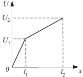 На каждом из участков: $0 < x< l_1, l_1 < x< l_2$ удельное сопротивление постоянно, т.к. напряжение U линейно зависит от длины участка. Удельное сопротивление на первом участке больше, чем на втором, т.к. напряжение на нем растет быстрее, чем на втором.
