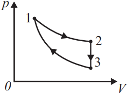КПД тепловой машины, работающей по циклу, состоящему из изотермы 1–2, изохоры 2–3, адиабаты 3–1, равен η, а разность максимальной и минимальной температуры газа в цикле равна ∆T . Определите работу, совершаемую ν молями одноатомного идеального газа за один цикл в изотермическом процессе.