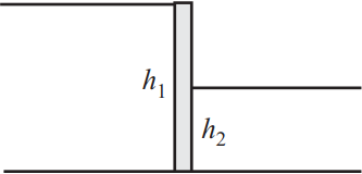 Канал шириной L = 4 м перегорожен плотиной, причём глубина канала с одной стороны h1, а с другой стороны h2 = 2 м (h1 > h2). Сила давления неподвижной воды на плотину равна 1200 кН. Чему равна глубина канала h1? Ответ выразите в (м).